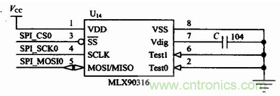 由於串行通信的輸出信號直接來自於MLX90316的內部DSP輸出,SPI輸出模式更穩定,誤差更小,並且具有更高的抗幹擾能力。在本設計中,選用SPI接口,具體的硬件接口連接電路如圖3所示。在圖3中,MLX90316的SPI三根線與ARM LPC2136的SPl0口連接。SPI(SerialProtocol InterIace)總線接口是一種同步串行外設接口。這是一個4根信號線的串行接口協議,包括主、從兩種模式。這4根信號線分別是:時鍾線(SCK)、數據輸入線(MISO)、數據輸出線(MOSI)和從設備使能線(SS)。