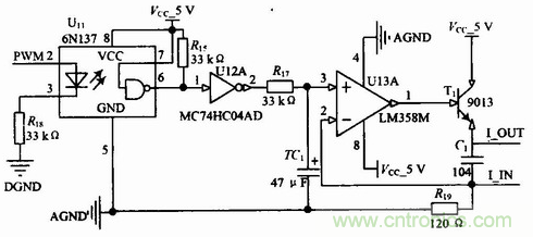 數據處理單元具備一路可控4~20 mA的電流輸出,用於現場指示儀表的驅動。具體的連接電路如圖4所示。其中PWM2連接ARM的PWM2引腳,PWM信號用於控製光耦的導通與截止,反相器主要用於波形的整定,根據磁敏角度和位移關係,建立數學模型,計算出PWM的占空比,從而達到電流大小調節的目的。