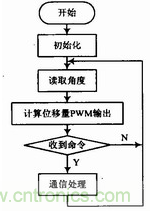 軟件編程主要包含3個模塊:PWM控製電流輸出模塊、RS 485通信模塊、MLX90316的SPI通信模塊,編程流程如圖5所示。PWM控製電流輸出模塊主要通過改變PWM的占空比來調節電流的大小。RS 485通信模塊主要用來接收上層係統的指令並根據指令將數據回傳。MLX90316的SPI通信模塊主要用於磁敏角度的讀取,SPI的通訊過程為:主控端先輸出1個0xAA以及1個0xFF作為通信起始信號,然後接著輸出8個0xFF,而從端會同時輸出2個0xFF、4個字節的角度信號以及4個0xFF,從而完成一次數據通訊。