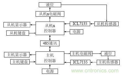 基本工作流程為:主機通過鍵盤設定自己和從機的液位,超聲波傳感器測出當前水位對應的電壓值,再經過ICL7135 模數轉化送入控製器與設定值比較,單片機通過控製電磁閥調節主機液位,並把設定值與當前值顯示在LCD 上;主機控製器通過485 通訊對從機控製器傳輸設定值,從機控製器也可以如主機控製器一樣對液位進行控製,並通過LCD 顯示主機給定值與當前液位值;並利用485 通訊把從機當前液位傳送給主機顯示出來。