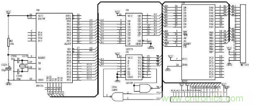 本設計使用的最小係統板是以80C52 單片機為內核,並且具有良好的擴展性。CPU 外接11.0592MHz 的晶振,主要由74LS373 鎖存電路、74LS138 譯碼電路以及按鍵、顯示器件、ICL7135 及其外圍典型電路組成,並用8255 外擴了I/O 接口。最小係統電路如圖2 所示。