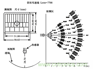 菲涅耳透鏡(圖3)根據菲涅耳原理製成,把紅外光線分成可見區和盲區,同時又有聚焦的作用,使熱釋電人體紅外傳感器 (PIR) 靈敏度大大增加。菲涅耳透鏡折射式和反射式兩種形式,其作用一是聚焦作用,將熱釋的紅外信號折射(反射)在PIR上;二是將檢測區內分為若幹個明區和暗區,使進入檢測區的移動物體能以溫度變化的形式在PIR上產生變化熱釋紅外信號,這樣PIR就能產生變化電信號。