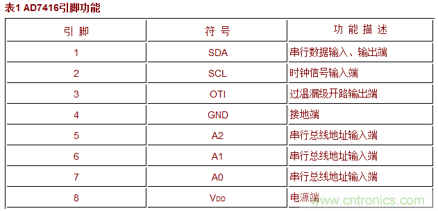 AD7416采用8腳表麵貼SO和8腳小型SOIC封裝形式,圖1所示為AD7416的引腳排列圖,各引腳功能如表1所列。