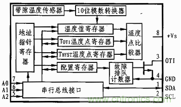 與I2C兼容的接口總線在AD7416上電後就一直有效,因此在芯片處於休眠狀態下仍可進行片內數據的讀出和寫入。