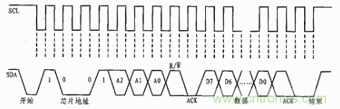 AD7416采用I2C串行總線和數據傳輸協議來實現同外設的數據傳輸。在數據傳輸過程中AD7416作為從器件通過數據輸入/輸出線SDA以及時鍾信號線SCL與總線相連。其傳輸時序如圖3所示。當SCL保持高電平時,SDA從高電平到低電平的跳變為數據傳輸的開始信號,隨後傳送AD7416的地址信息的讀/寫控製位。其地址信息的格式為:100A2A1A0R/W。