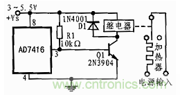 這些默認值可使該溫度傳感器在不連接串行總線時用作自動調溫器,圖4所示就是AD7416作為自動調溫器的典型應用電路原理圖。當被測量的環境溫度低於 THYST時,OTI輸出高電平,Q1導通,繼電器吸合,加熱器開始工作;當被測量的環境溫度高於TOTI時,OTI輸出低電平,將Q1的基極電位拉低以使其截止,繼電器釋放,加熱器停止工作。