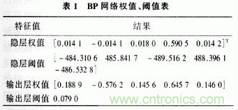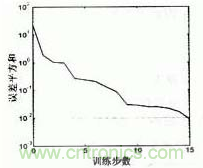 在實際中,根據測量範圍和精度要求,以實驗中的101個數據為樣本,在MATLAB中構造BP網絡進行訓練。在訓練之前,對數據進行了預處理。諧振頻率值為輸入樣本P,將冰層厚度變換到[-1,1]的範圍後作為輸出樣本t。訓練完後,再通過後處理還原回原來的樣本空間。神經網絡模型為單輸入單輸出,隱含層有5個神經元,訓練中誤差指標定為0.01。訓練結果如圖2、圖3、表1。訓練進行了15步就滿足了誤差要求,收斂速度較快。