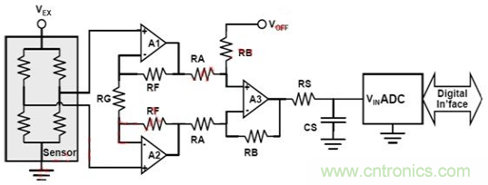 其中VREF代表ADC的參考電壓,“Sensor FS”是傳感器的滿刻度輸出值。假設電阻完美匹配,那麼儀表放大器的增益等於: