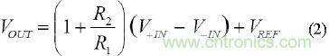 該儀表放大器的傳遞函數在形式上與經典三運放拓撲結構的 傳遞函數相同,其計算公式為
