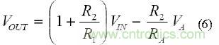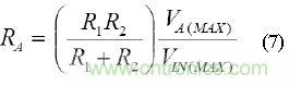 為了找到一個RA值以允許最大失調調整範圍VIN(MAX), 在給定調整電壓範圍VA(MAX)的情況下,使VOUT=0,求RA,結果得到