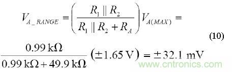 由於DAC可以擺動±1.65 V,因此,總失調調整範圍可通過由RA 以及R1和R2的並聯組合形成的分壓器給定,其計算方法如下: