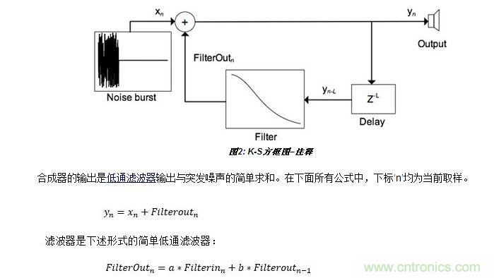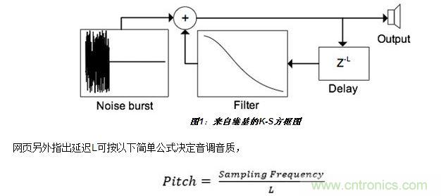數字聲音合成技術總讓我這個業餘愛好者感到著迷。一個有關Karplus-Strong吉他合成技術的維基網頁更加激發了我的興趣。它吸引我的地方是這種合成器設計非常簡單。下麵是來自維基網頁的圖形(圖1):