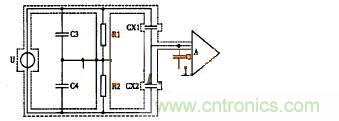 disangewentishifenbudianrongdeyingxiang。youyudianrongchuanganqiyigehenguanjiandewentishifenbudianrongdianrongliangyuchuanganqidianrongliangxiangbibujinbunenghulve,erqieyingxianghaijiqiyanzhong,qihouguoshizaochengchuanshuxiaolvjiangdi、靈敏度下降、測量誤差增加及穩定性變差。近幾年來,對此問題有了新的解決途徑。其中“整體屏蔽法”就是一例,以差動電容傳感器為例,說明整體屏蔽法,在下圖中,CX1、CX2為差動電容,U為電源,A為放大器,整體屏蔽法是把整個電橋(包含電源電纜等)一起屏蔽起來,設計的關鍵點在於接地點的合理設置。采用把接地點放在兩個平衡電阻R1、R2之間與整體屏蔽共地,這樣,傳感器公用極板與屏蔽之間的分布電容C1與放大器的輸入阻抗並聯,從而可把C1視作放大器的輸入電容。由於放大器的輸入阻抗有極大值,C1的並聯也不希望存在,但它隻影響靈敏度而已,另外兩個分布電容C3、C4並聯在橋臂R1、R2shang,huiyingxiangdianqiaodechushipinghenghezhengtilingmindu,bingbuyingxiangdianqiaodezhengchanggongzuo。yinci,fenbucanshuduichuanganqidianrongdeyingxiangjibenxiaochu,zhengtipingbifashijiejuedianrongchuanganqifenbudianrongwentidehenhaofangfa,quedianshishijiegoufuza。