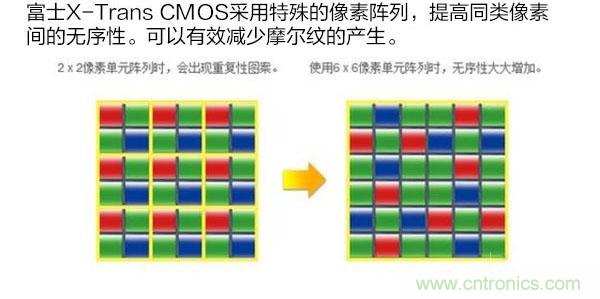 傳統的拜耳陣列傳感器,R/G/B三色的點陣距離相同,因此在拍攝特定密度的規律物體時,就容易產生摩爾紋。富士的X-Trans CMOS采cai用yong了le全quan新xin色se彩cai濾lv鏡jing陣zhen列lie,降jiang低di了le傳chuan感gan器qi像xiang素su間jian的de規gui律lv性xing,使shi得de像xiang素su點dian本ben身shen有you類lei似si膠jiao片pian銀yin鹽yan顆ke粒li的de不bu規gui則ze排pai列lie效xiao果guo,從cong而er降jiang低di摩mo爾er紋wen的de產chan生sheng。