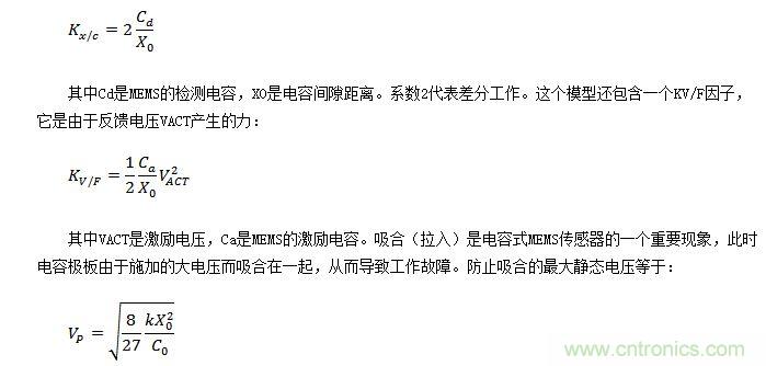 MEMS傳感器的工作原理基於這樣一個事實:給MEMS施加一個輸入力(Fin)將產生一定的位移,進而改變MEMS電容(Cout)。這個Cout可以用連接MEMS單元的電路進行測量。帶激勵電極的MEMS傳感器建模如圖1所示。這個模型的增益是Kx/c,代表由於MEMS質量塊位移引起的輸出電容變化。Kx/c等於: