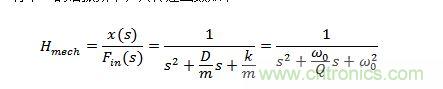 實現閉環工作的另外一種方法使用兩級bang-bang反饋信號。由於隻用到兩個點的二次V/F關係,這種方法天生就是線性的,而且並不依賴MEMS電容的匹配或使用負電壓去抵消非線性。使用兩級激勵意味著將反饋信號幅度中的信息轉換為時間信息。因此Σ-Δ調製可以成為實現閉環數字讀取傳感器的一種有效技術。另外,基於Σ-Δ的環路默認提供模數轉換功能,因此不需要再使用單獨的A/D。Σ-Δ閉環架構代表了高性能數字讀取傳感器的最優架構。值得注意的是,Σ-Δ係統的超采樣特性會使操作係統工作在相對較高的頻率,因此係統變得較易受MEMS寄生電容耦合的影響。盡管如此,抵消這種耦合的電路技術已經非常成熟,並且可以在傳感器的接口ASIC中實現。Σ-Δ閉環傳感器的架構選擇需要依據為電子Σ-Δ係統開發的深層技術。然而,具有自然電子-機械特性的Σ-Δ閉環傳感器在係統級設計與優化時需要正確理解MEMS的工作原理和建模機製。典型MEMS傳感器的檢測部分行為就像是一個二階集總式質量塊(阻尼器)彈簧機械係統,具有單一的諧振頻率,其傳遞函數如下: