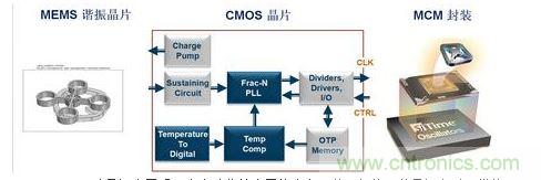 MEMS矽晶振由於采用全自動化的半導體工藝,內部兩個晶片(一個是MEMS諧振晶片、一個是具有溫補功能的鎖相環CMOS電路)采用MCM封裝在一起。
