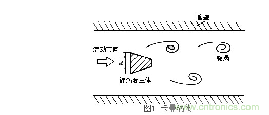 根據卡曼渦街理論(見圖一),在無限界流場中垂直插入一根無限長的非線性阻力體(即旋渦發生體C,風速傳感器的探頭橫杆),當風流流經旋渦發生體C時,在漩渦發生體邊緣下遊側會產生兩排交替的、內旋的旋渦列(即氣流旋渦),而旋渦的產生頻率f正比於流速V,用公式表示如下: