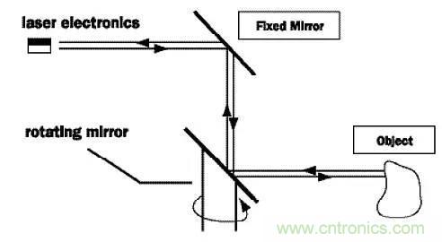 這套發射/接jie收shou組zu件jian和he旋xuan轉zhuan鏡jing麵mian結jie合he在zai一yi起qi,能neng掃sao描miao至zhi少shao一yi個ge平ping麵mian。鏡jing麵mian不bu隻zhi反fan射she二er極ji管guan發fa出chu去qu的de光guang,而er且qie也ye能neng把ba反fan射she回hui來lai的de光guang再zai反fan射she給gei接jie收shou器qi。通tong過guo旋xuan轉zhuan鏡jing麵mian,能neng夠gou實shi現xian90到180度的視角,並且大大降低係統設計和製造的複雜度,因為鏡麵是這裏麵唯一的運動機構。