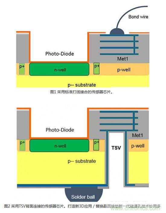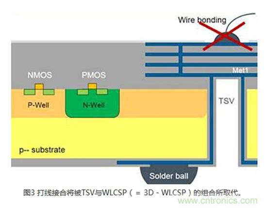 模擬3DIC技術通常是透過建造芯片正麵到IC背麵的電氣連接來實現傳感器應用。 在許多傳感器應用,例如光學、化學、氣體或壓力傳感器中,感測區域是位在CMOS側(晶圓的頂端)。 芯片和導線架之間最常用的連接是打線接合(Wire bonding)(圖1)。 無論是使用塑料封裝,或是將裸片直接接合在印刷電路(PCB)或軟性電路板上,對於某些會將感測區域暴露出來的應用而言,打線接合並非理想的解決方案。 采用專業晶圓代工業者的專有TSV技術,可以利用TSV、背麵RDL和芯片級封裝(WLCSP)(圖2)來替代打線。