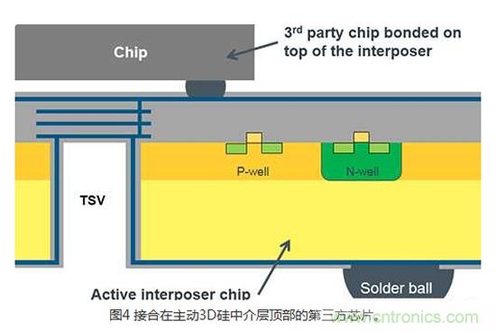 3DIC技術的另一個變化和極為創新的發展,是矽中介層架構(Silicon interposer architecture)。 所謂的被動3D矽中介層是用來產生一個從芯片的頂端到底部的簡單電氣連接。 所謂的主動3D矽中介層能支持實現完整CMOS設計所需製程技術的所有被動和主動組件。