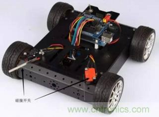 在機器人比賽中,碰撞開關經常被用在碰撞壁障小車上(見圖3)。小xiao車che前qian端duan的de碰peng撞zhuang開kai關guan在zai碰peng撞zhuang到dao障zhang礙ai物wu時shi就jiu會hui給gei控kong製zhi器qi反fan饋kui一yi個ge信xin號hao,告gao訴su控kong製zhi器qi前qian方fang左zuo側ce或huo右you側ce有you障zhang礙ai物wu,程cheng序xu再zai控kong製zhi小xiao車che轉zhuan彎wan避bi開kai障zhang礙ai物wu。