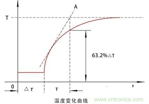 實踐證明熱電偶、熱電阻、雙金屬溫度計當被測溫度突然發生變化時,其輸出會延遲一段時間,這段延遲時間△τ一般叫做純滯後或純時延。在延遲△τ後,會以近似於指數曲線的規律變化(如下圖所示),如忽略△τ,並以介質溫度變化做計時起點,則上述曲線符合T=△T(1-e-t/τ),此式中T為溫度;△T為溫度變化;t為時間;τ為時間常數。時間常數及時反應曲線起點的切線與平衡溫度交點A所對應的時間,也就是輸出變化63.2%△T所需要的時間。