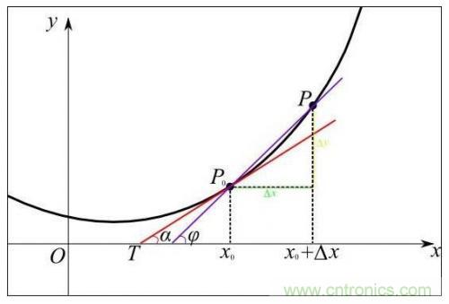 從幾何意義上看,變化率就變成了斜率,這更容易理解怎樣求函數的最小值。例如下圖中有函數y=f(x)用粗體黑線表示,其在P0點的變化率就是切線紅線的斜率:
