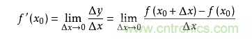 導數求的是函數在某一點上的變化率。例如從A點開車到B點,通過距離和時間可以算出平均速度,但在其中C點的瞬時速度是多少呢?如果用x表示時間,f(x)表示車子從A點駛出的距離,那麼在x0的瞬時速度可以轉化為:從x0時再開一個很小的時間,例如1秒,那麼這一秒的平均速度就是這一秒開出的距離除以1秒,即(f(1+x0)-f(x0))/1。如果我們用的不是1秒而是1微秒,那麼這個1微秒內的平均速度必然更接近x0時的瞬時速度。於是,到該時間段t趨向於0時,我們就得到了x0時的瞬時速度。這個瞬時速度就是函數f在x0上的變化率,所有x上的變化率就構成了函數f(x)的導數,稱為f`(x)。即: