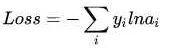 然而實際上x對應的概率其實是第一類,比如[1,0,0],現在拿到的概率(或者可稱為似然)是[0.88、0.12、0]。那麼它們之間究竟有多大的差距呢?這個差距就是損失值loss。如何獲取到損失值呢?在softmax裏我們用互熵損失函數計算量最小(方便求導),如下所示: