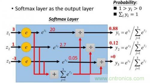 這樣給定x後可以得到x在各個類別下的概率。假定三個類別的得分值分別為3、1、-3,則按照上麵的公式運算後可得概率分別為[0.88、0.12、0],計算過程如下圖所示: