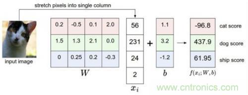 比如我們有訓練數據集照片對應著cat、dog、ship三個類別,某個輸入照片經過函數f(x)=x*W+b,前向運算得到該照片屬於這3個分類的得分值。此時,這個函數被稱為得分函數,如下圖所示,假設左邊關於貓的input image是一個4維向量[56,231,24,2],而W權重是一個4*3的矩陣,那麼相乘後再加上向量[1.1,3.2,-1.2]可得到在cat、 dog、ship三個類別上的得分:
