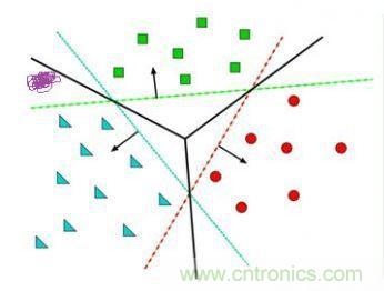 給定隨機數作為a,c,b的初始值,我們通過訓練數據不斷的優化參數a,b,c,把不合適的L1、L3等分類函數逐漸訓練成L2,這樣的L2去麵對泛化的測試數據就可能獲得更好的效果。然而如果有多個類別,就需要多條分類直線才能分出,如下圖所示: