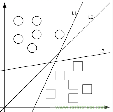 上圖中的二維數據x隻有方形和圓形兩個類別y,很好分,我們需要學習的分類函數用最簡單的f(x,y)=ax+by+c就能表示出分類直線。例如f(x,y)大於0時表示圓形,小於0時表示方形。
