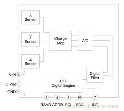的Kionix公司KXCJ9是3軸矽與一係列+/- 2克,±4克或±8克微機械加速度計。檢測元件采用Kionix公gong司si專zhuan有you的de等deng離li子zi微wei加jia工gong工gong藝yi技ji術shu構gou建jian。加jia速su度du傳chuan感gan是shi基ji於yu來lai自zi感gan測ce元yuan件jian,其qi采cai用yong共gong同tong模mo式shi解jie除chu從cong傳chuan感gan元yuan件jian的de設she計ji,以yi減jian少shao這zhe種zhong情qing況kuang發fa生sheng,從cong工gong藝yi變bian化hua,溫wen度du的de任ren何he錯cuo誤wu的de加jia速su度du引yin起qi的de運yun動dong而er產chan生sheng的de差cha分fen電dian容rong的de原yuan理li,和he環huan境jing壓ya力li。感gan測ce元yuan件jian被bei氣qi密mi密mi封feng在zai由you使shi用yong玻bo璃li料liao使shi用yong密mi閉bi封feng裝zhuang的de第di二er矽gui晶jing片pian蓋gai接jie合he到dao所suo述shu裝zhuang置zhi中zhong,而er不bu是shi在zai晶jing片pian級ji,這zhe有you助zhu於yu減jian小xiao裝zhuang置zhi的de整zheng體ti尺chi寸cun。
