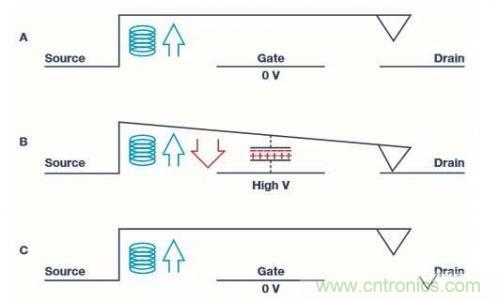 請注意,即便是在開啟位置上,開關梁仍然會有將開關往上拉動的彈簧力(藍色箭頭),但是隻要向下拉動的靜電力量比較大,那麼開關就會維持在開啟的狀態。 最後,當閘極電壓被移除時(圖一中的C狀況),也就是在閘極電極上0 V,靜電吸引力也會跟著消失,而開關梁會以具有足夠回複力(藍色箭頭)的彈簧而動作,開啟源極與汲極之間的鏈接,然後回返至原本的關閉位置。