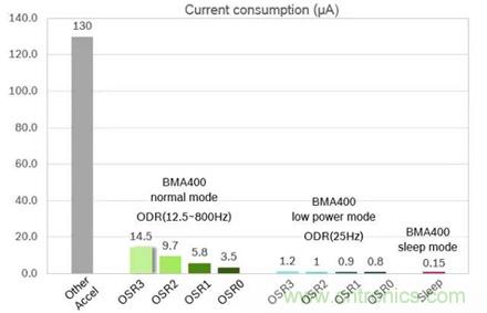 BMA400在低功耗模式(low power mode)消耗的電流會更低,最低可以達到0.8uA (800nA,OSR=0) 。