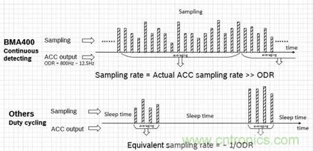 可是,如我們前述“加速度傳感器在物聯網應用中扮演重要角色”,傳感性能決定了係統能否基於傳感器做出精準的識別和決策。為了提高對原始信號的有效采集,並降低噪聲及高頻信號的幹擾(混疊Aliasing),BMA400在正常工作模式下,采用了連續采樣和滑動低通濾波的方式。
