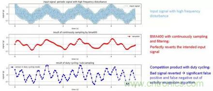下圖顯示了連續采樣(continuous sampling)和周期休眠(duty cycling)兩種不同的采樣模式對於高頻噪聲的抗幹擾能力的顯著區別。