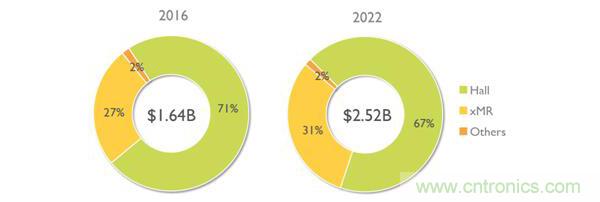 xMR磁阻傳感器市場的增長或與霍爾技術相結合,或搶占了後者的市場份額。根據Yole發布的《磁傳感器市場與技術-2017版》報告, xMR技術的主要優勢體現在更高的靈敏度,因此它們主要用於電子羅盤和位置測量,尤其是精確的角度測量應用。