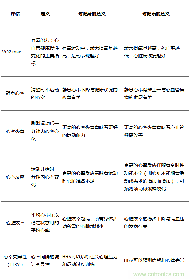 【導讀】在日益數字化的世界中,光學心率傳感器在可穿戴設備中的應用越來越廣泛。這些設備中數不清的應用可提供從個人活動、健身水平到健康狀況的所有內容。精準的生物識別傳感器數據可以提供準確的健身/健康評估,但設計師和工程師究竟能用這些評估做些什麼呢?表1總結了目前在健身應用中使用的一些常見評估,這些評估也證明了健康醫療的意義。