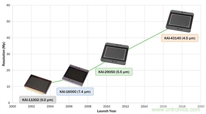 Interline Transfer CCD技術用於開發高分辨率、大格式圖像傳感器已超過15年,其分辨率隨市場需要逐漸提高。例如,2003年的KAI-11000圖像傳感器以35 mm光學格式提供1100萬像素的分辨率;但到2011年,這種相同的光學格式幾乎可支持三倍的分辨率。