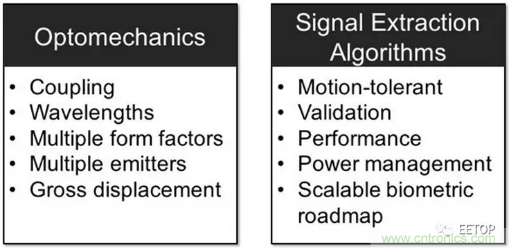 光力學耦合 - 在傳感器與人體之間是否能夠高效進行雙向光導與耦合?使血流信號最大化和向傳感器施加噪音的環境噪音(如日光)最小化,是其中的關鍵。