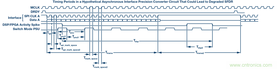 在圖15中,標記了各種定時周期,這很容易幹擾SFDR或導致抖動。如果SPI通信未頻鎖到MCLK,則可能發生雜散。掌握布局技術是您緩解此問題的最大保障。頻率表現為混疊下行幹擾源,但也作為拍頻和交調產物。例如,如果SPI在16.01 MHz下運行,MCLK在16 MHz下運行,則應在10 kHz下發生雜散。