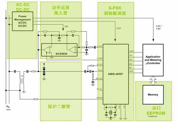 此外,AMIS-49587采用S-FSK調製技術,結合高分辨率的濾波算法,配以自動可信值/中繼器(repeater)功能,提供基於長距離電力線的 高可靠性數據通信。通信誤差比其它可選及現有方案更低。這器件藉板載低抖動鎖相環(PLL)與交流主電源(mains)信號同步。由於包含16位分辨率的 模擬前端,使器件具有極優的噪聲免疫性和極高的接收靈敏度。