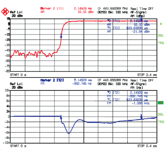 對於發射機和頻綜源來說,它們的幅度、頻率和相位瞬態特性是重要的測試指標。一般來說,頻率穩定時間是指發射機在輸出電平達到一定數值(通常為穩定輸出功率-30dB)開始,監測FM解調頻譜,直到頻率穩定到設計限值之內的這一段時間。