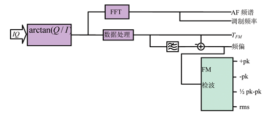 其中,Fm為輸入信號的頻率。對相鄰點相位差值對時間求導,得出頻率值。在測量時間內的所有Fm數值構成IQ幅度數組Fm-DC。
