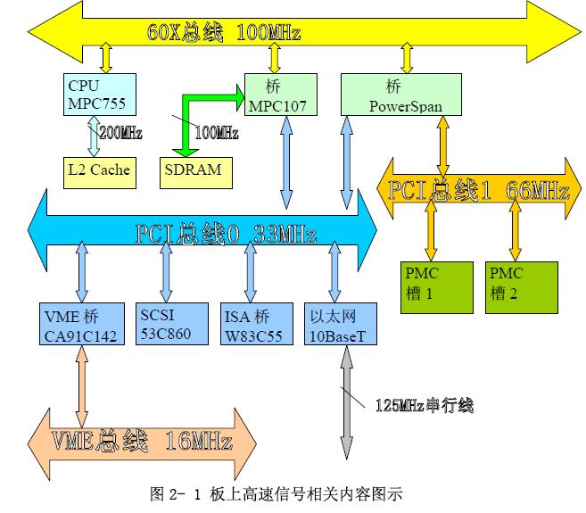 我們設計的是基於PowerPC的主板,主要由處理器MPC755、北橋MPC107、北橋PowerSpanII、VME橋CA91C142B等一些電路組成,上麵的高速信號如圖2-1所示。